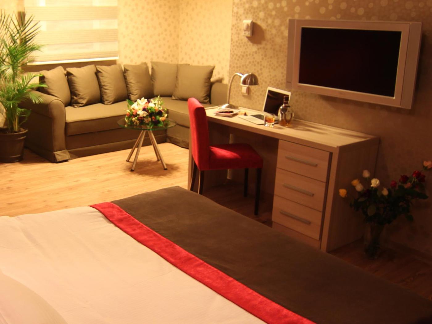 Double Suite. The air-conditioned suite features 1 bedroom and 1 bathroom with a shower and a hairdryer. The suite offers a minibar, a seating area, a wardrobe, a flat-screen TV with satellite channels, as well as city views. The unit offers 2 beds. ;